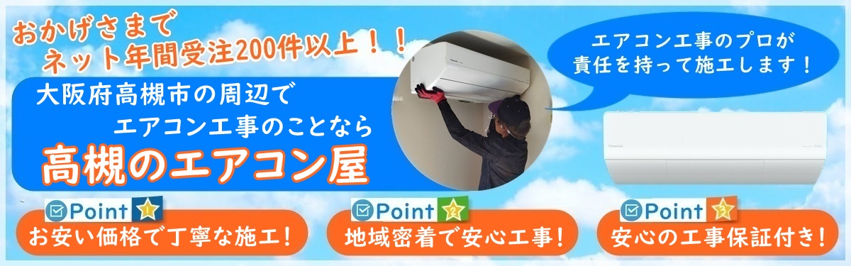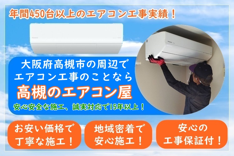 高槻のエアコン屋は家庭用のエアコン工事を主にエアコン取り付け・取り外し工事をおこなっている地域密着のエアコン業者で、高槻市を中心に大阪府で活動しております。